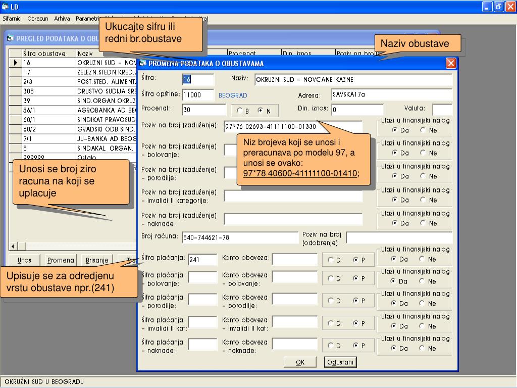 Ukucajte sifru ili redni br.obustave Naziv obustave Niz brojeva koji se unosi i preracunava po modelu 97, a unosi se ovako: 97*78 40600-41111100-01410; Unosi se broj ziro racuna na koji se uplacuje Upisuje se za odredjenu vrstu obustave npr.(241)