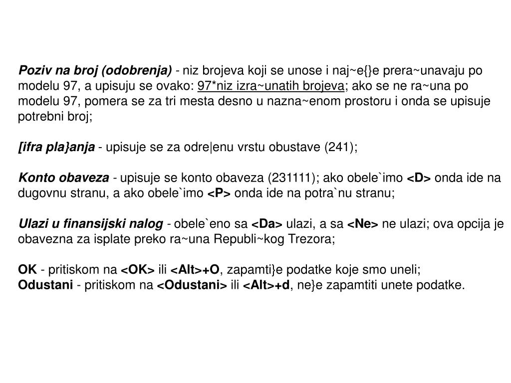 Poziv na broj (odobrenja) - niz brojeva koji se unose i naj~e{}e prera~unavaju po modelu 97, a upisuju se ovako: 97*niz izra~unatih brojeva; ako se ne ra~una po modelu 97, pomera se za tri mesta desno u nazna~enom prostoru i onda se upisuje potrebni broj; [ifra pla}anja - upisuje se za odre|enu vrstu obustave (241); Konto obaveza -upisuje se konto obaveza (231111); ako obele`imo <D> onda ide na dugovnu stranu, a ako obele`imo <P> onda ide na potra`nu stranu; Ulazi u finansijski nalog - obele`eno sa <Da> ulazi, a sa <Ne> ne ulazi; ova opcija je obavezna za isplate preko ra~una Republi~kog Trezora; OK - pritiskom na <OK> ili <Alt>+O, zapamti}e podatke koje smo uneli; Odustani - pritiskom na <Odustani> ili <Alt>+d, ne}e zapamtiti unete podatke.