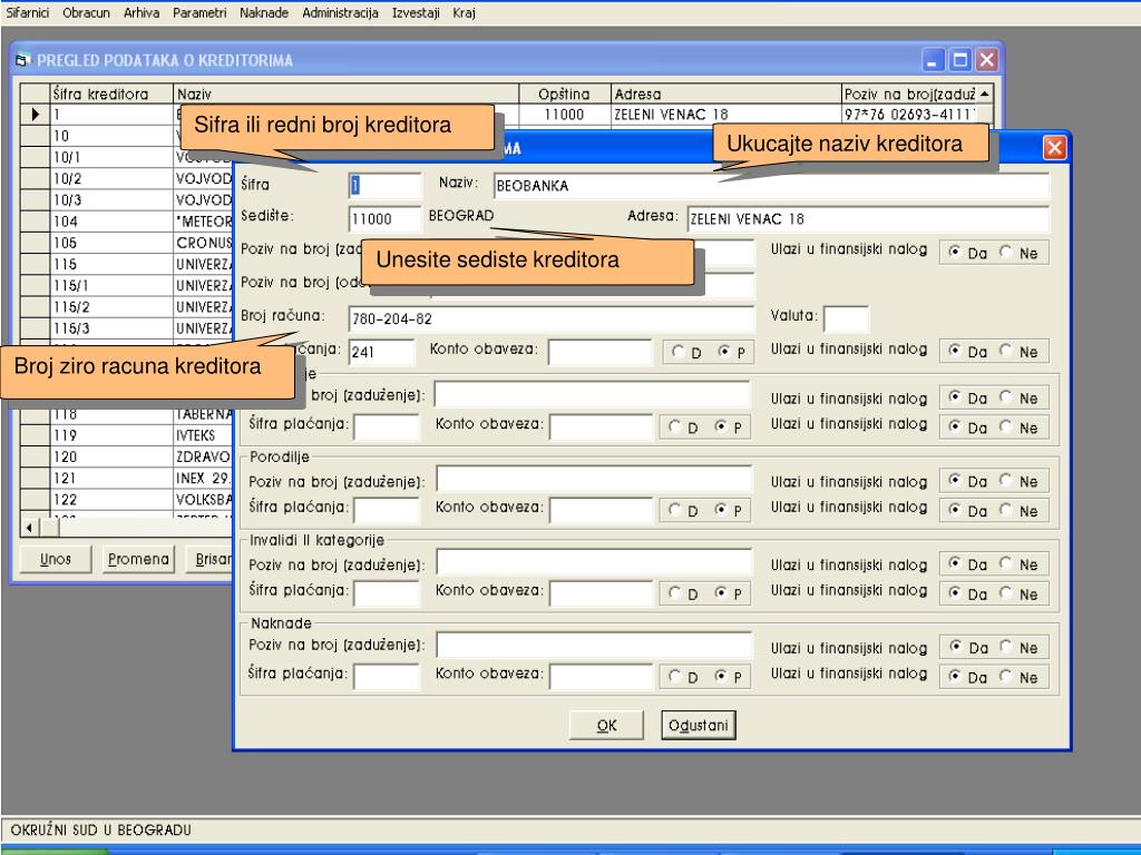 Sifra ili redni broj kreditora Ukucajte naziv kreditora Unesite sediste kreditora Broj ziro racuna kreditora