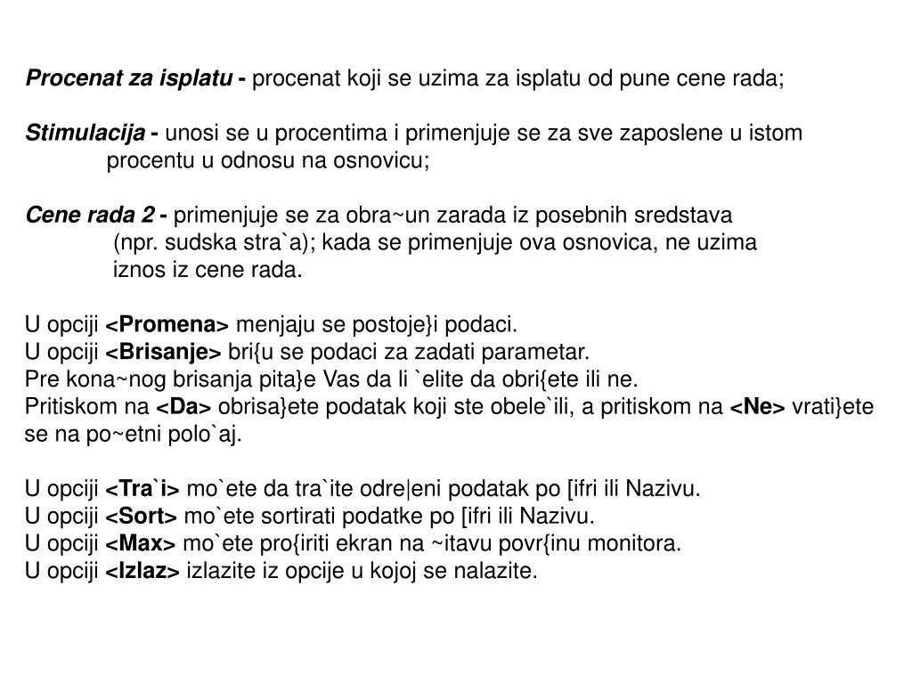 Procenat za isplatu - procenat koji se uzima za isplatu od pune cene rada; Stimulacija - unosi se u procentima i primenjuje se za sve zaposlene u istom procentu u odnosu na osnovicu; Cene rada 2 - primenjuje se za obra~un zarada iz posebnih sredstava (npr. sudska stra`a); kada se primenjuje ova osnovica, ne uzima iznos iz cene rada. U opciji <Promena> menjaju se postoje}i podaci. U opciji <Brisanje> bri{u se podaci za zadati parametar. Pre kona~nog brisanja pita}e Vas da li `elite da obri{ete ili ne. Pritiskom na <Da> obrisa}ete podatak koji ste obele`ili, a pritiskom na <Ne> vrati}ete se na po~etni polo`aj. U opciji <Tra`i> mo`ete da tra`ite odre|eni podatak po [ifri ili Nazivu. U opciji <Sort> mo`ete sortirati podatke po [ifri ili Nazivu. U opciji <Max> mo`ete pro{iriti ekran na ~itavu povr{inu monitora. U opciji <Izlaz> izlazite iz opcije u kojoj se nalazite.