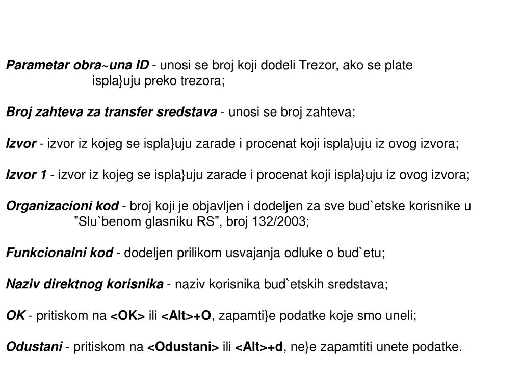 Parametar obra~una ID - unosi se broj koji dodeli Trezor, ako se plate ispla}uju preko trezora; Broj zahteva za transfer sredstava - unosi se broj zahteva; Izvor - izvor iz kojeg se ispla}uju zarade i procenat koji ispla}uju iz ovog izvora; Izvor 1 - izvor iz kojeg se ispla}uju zarade i procenat koji ispla}uju iz ovog izvora; Organizacioni kod - broj koji je objavljen i dodeljen za sve bud`etske korisnike u ”Slu`benom glasniku RS”, broj 132/2003; Funkcionalni kod - dodeljen prilikom usvajanja odluke o bud`etu; Naziv direktnog korisnika - naziv korisnika bud`etskih sredstava; OK - pritiskom na <OK> ili <Alt>+O, zapamti}e podatke koje smo uneli; Odustani - pritiskom na <Odustani> ili <Alt>+d, ne}e zapamtiti unete podatke.