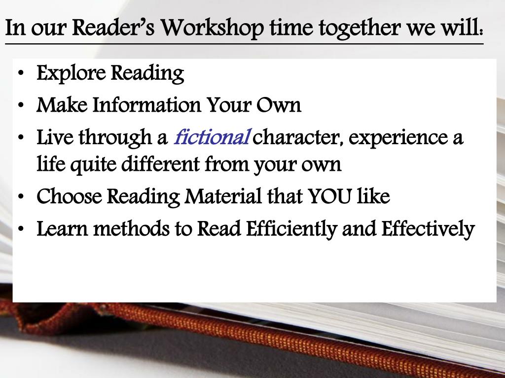 In our Reader’s Workshop time together we will: Reader’s Workshop • Explore Reading • Make Information Your Own • Live through a fictional character, experience a life quite different from your own • Choose Reading Material that YOU like • Learn methods to Read Efficiently and Effectively