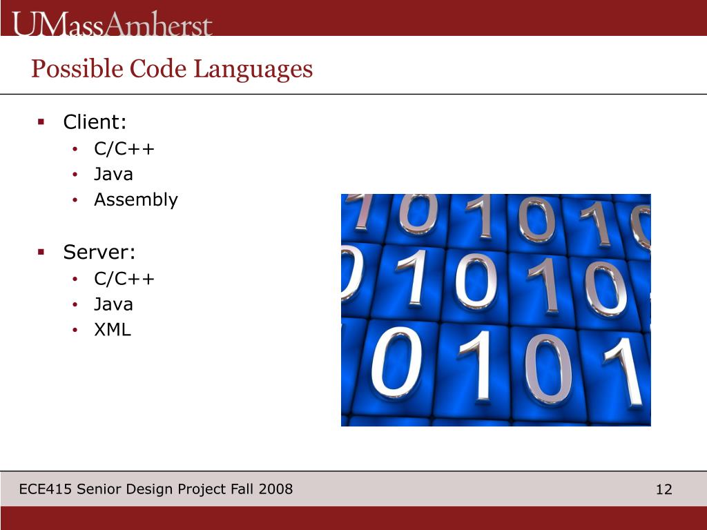 Possible Code Languages • Client: • C/C++ • Java • Assembly • Server: • C/C++ • Java • XML