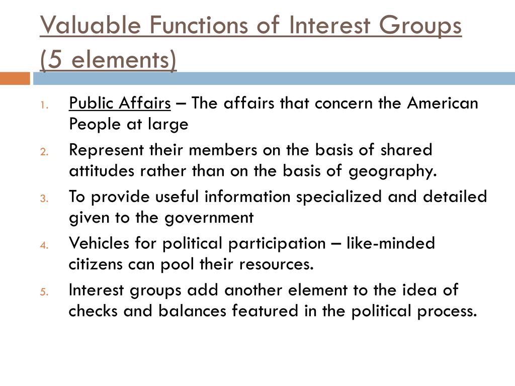 Valuable Functions of Interest Groups (5 elements) • Public Affairs – The affairs that concern the American People at large • Represent their members on the basis of shared attitudes rather than on the basis of geography. • To provide useful information specialized and detailed given to the government • Vehicles for political participation – like-minded citizens can pool their resources. • Interest groups add another element to the idea of checks and balances featured in the political process.