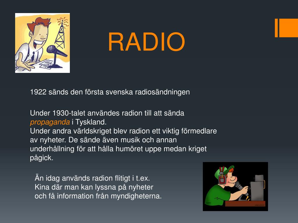 RADIO 1922 sänds den första svenska radiosändningen Under 1930-talet användes radion till att sända propaganda i Tyskland. Under andra världskriget blev radion ett viktig förmedlare av nyheter. De sände även musik och annan underhållning för att hålla humöret uppe medan kriget pågick. Än idag används radion flitigt i t.ex. Kina där man kan lyssna på nyheter och få information från myndigheterna.