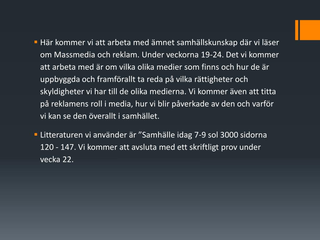 Här kommer vi att arbeta med ämnet samhällskunskap där vi läser om Massmedia och reklam. Under veckorna 19-24. Det vi kommer att arbeta med är om vilka olika medier som finns och hur de är uppbyggda och framförallt ta reda på vilka rättigheter och skyldigheter vi har till de olika medierna. Vi kommer även att titta på reklamens roll i media, hur vi blir påverkade av den och varför vi kan se den överallt i samhället. • Litteraturen vi använder är ”Samhälle idag 7-9 sol 3000 sidorna 120 - 147. Vi kommer att avsluta med ett skriftligt prov under vecka 22.