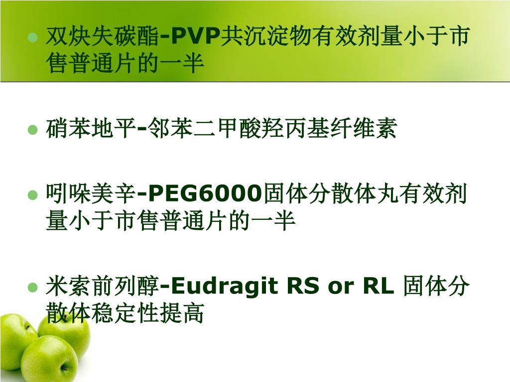 双炔失碳酯-PVP共沉淀物有效剂量小于市售普通片的一半双炔失碳酯-PVP共沉淀物有效剂量小于市售普通片的一半 • 硝苯地平-邻苯二甲酸羟丙基纤维素 • 吲哚美辛-PEG6000固体分散体丸有效剂量小于市售普通片的一半 • 米索前列醇-Eudragit RS or RL 固体分散体稳定性提高