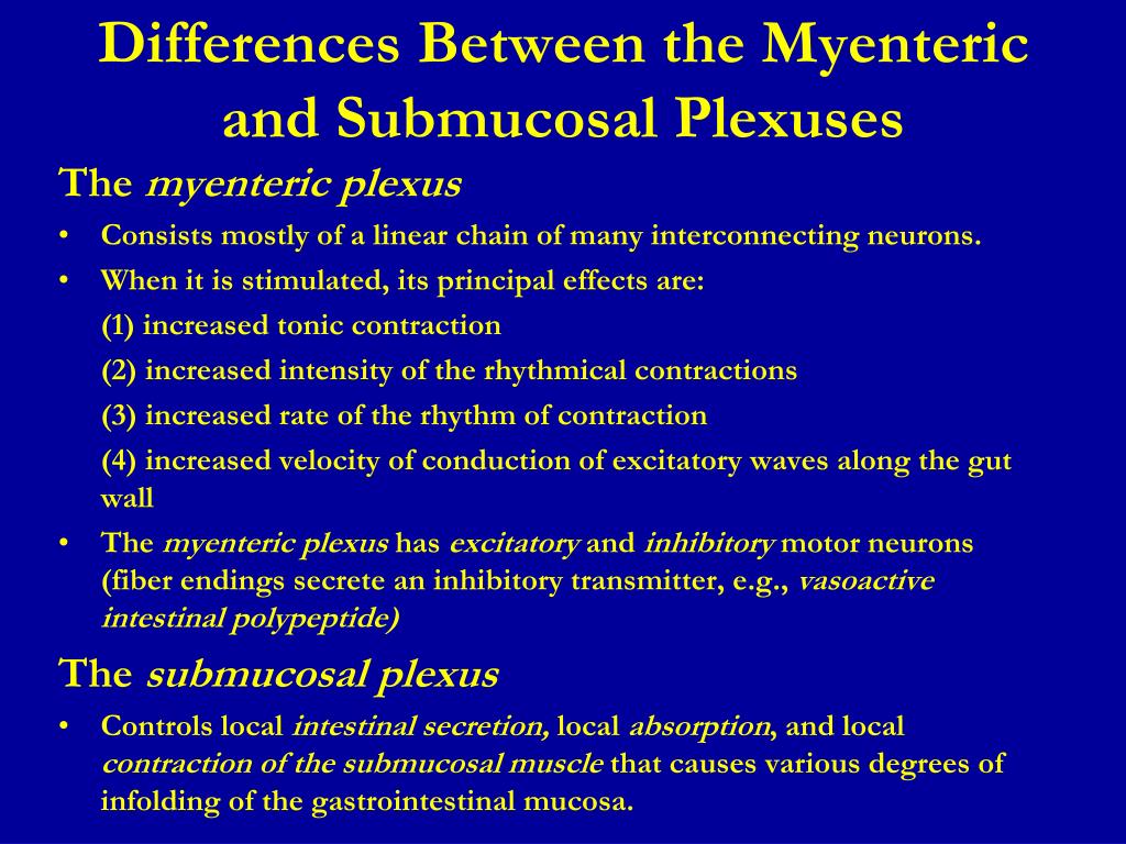 Differences Between the Myenteric and Submucosal Plexuses The myenteric plexus • Consists mostly of a linear chain of many interconnecting neurons. • When it is stimulated, its principal effects are: (1) increased tonic contraction (2) increased intensity of the rhythmical contractions (3) increased rate of the rhythm of contraction (4) increased velocity of conduction of excitatory waves along the gut wall • The myenteric plexus has excitatory and inhibitory motor neurons (fiber endings secrete an inhibitory transmitter, e.g., vasoactive intestinal polypeptide) The submucosal plexus • Controls local intestinal secretion, local absorption, and local contraction of the submucosal muscle that causes various degrees of infolding of the gastrointestinal mucosa.