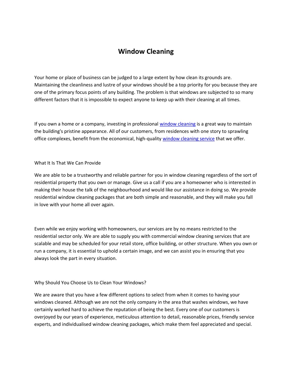 Window Cleaning Your home or place of business can be judged to a large extent by how clean its grounds are. Maintaining the cleanliness and lustre of your windows should be a top priority for you because they are one of the primary focus points of any building. The problem is that windows are subjected to so many different factors that it is impossible to expect anyone to keep up with their cleaning at all times. If you own a home or a company, investing in professional window cleaning is a great way to maintain the building's pristine appearance. All of our customers, from residences with one story to sprawling office complexes, benefit from the economical, high-quality window cleaning service that we offer. What It Is That We Can Provide We are able to be a trustworthy and reliable partner for you in window cleaning regardless of the sort of residential property that you own or manage. Give us a call if you are a homeowner who is interested in making their house the talk of the neighbourhood and would like our assistance in doing so. We provide residential window cleaning packages that are both simple and reasonable, and they will make you fall in love with your home all over again. Even while we enjoy working with homeowners, our services are by no means restricted to the residential sector only. We are able to supply you with commercial window cleaning services that are scalable and may be scheduled for your retail store, office building, or other structure. When you own or run a company, it is essential to uphold a certain image, and we can assist you in ensuring that you always look the part in every situation. Why Should You Choose Us to Clean Your Windows? We are aware that you have a few different options to select from when it comes to having your windows cleaned. Although we are not the only company in the area that washes windows, we have certainly worked hard to achieve the reputation of being the best. Every one of our customers is overjoyed by our years of experience, meticulous attention to detail, reasonable prices, friendly service experts, and individualised window cleaning packages, which make them feel appreciated and special.