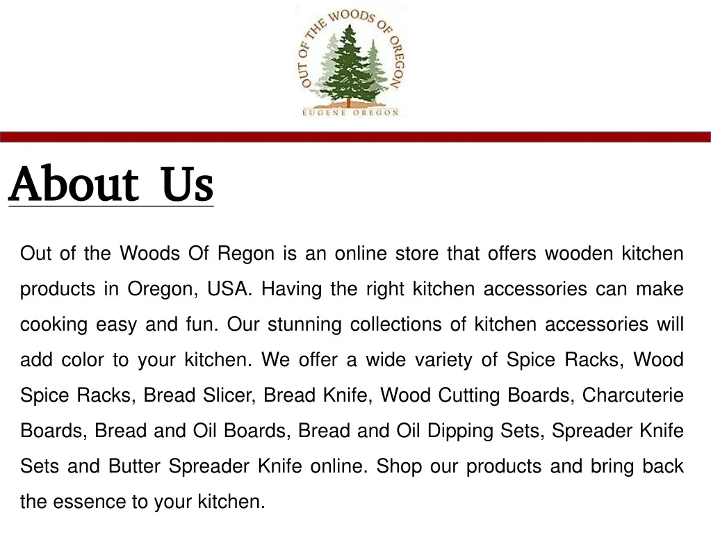 About Us Out of the Woods Of Regon is an online store that offers wooden kitchen products in Oregon, USA. Having the right kitchen accessories can make cooking easy and fun. Our stunning collections of kitchen accessories will add color to your kitchen. We offer a wide variety of Spice Racks, Wood Spice Racks, Bread Slicer, Bread Knife, Wood Cutting Boards, Charcuterie Boards, Bread and Oil Boards, Bread and Oil Dipping Sets, Spreader Knife Sets and Butter Spreader Knife online. Shop our products and bring back the essence to your kitchen.