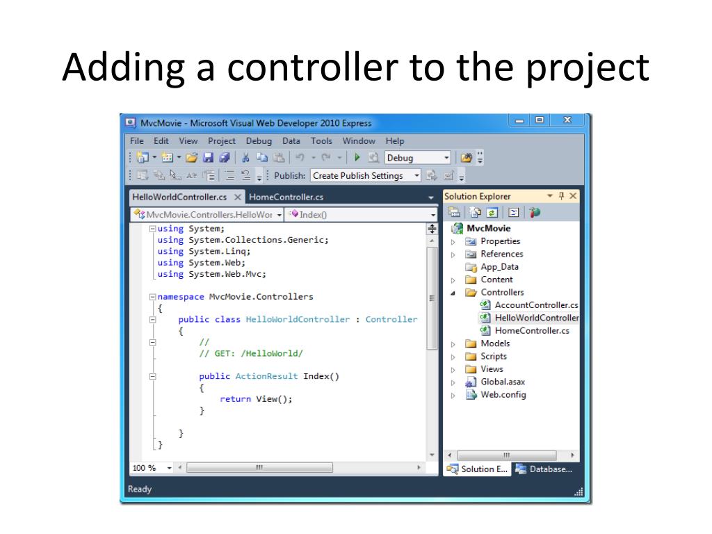 Building an app • One nice aspect (for some) is you can use Visual Studio for building apps. • The Primary language used for ASP.NET MVC is C#