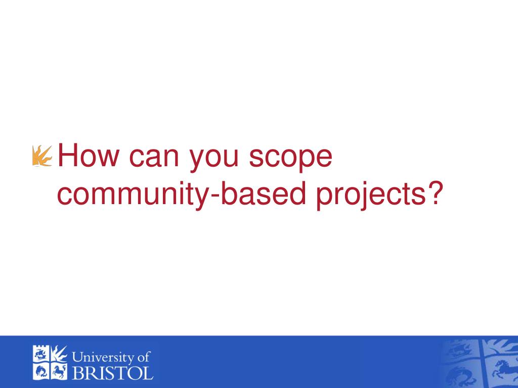 Overview of projects • 3rd year research projects and 4th year design projects • Undergraduates interns scoped potential community placements • Contacting and liaising with community partners • Co-designing feasible projects • Recruiting academic supervisors