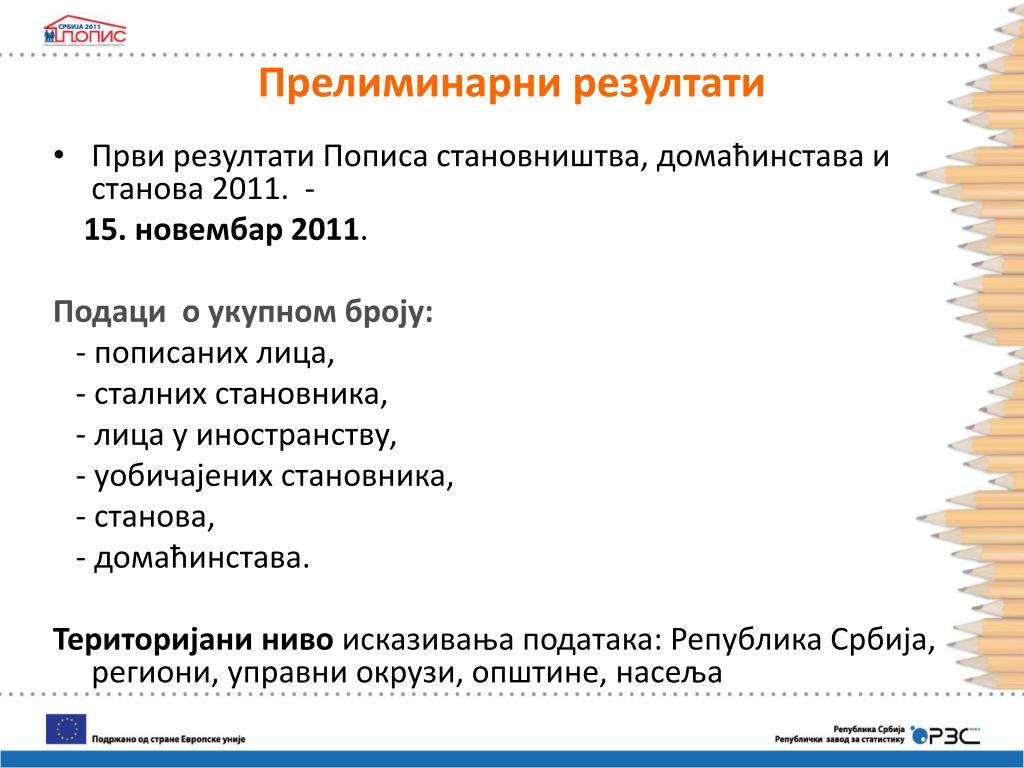 Прелиминарни резултати • Први резултати Пописа становништва, домаћинстава и станова 2011. - 15. новембар 2011. Подаци о укупном броју: - пописаних лица, - сталних становника, - лица у иностранству, - уобичајених становника, - станова, - домаћинстава. Територијани ниво исказивања података: Република Србија, региони, управни окрузи, општине, насеља