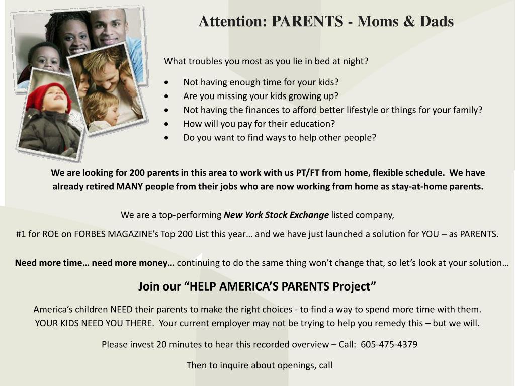 Attention: PARENTS - Moms & Dads • What troubles you most as you lie in bed at night? • Not having enough time for your kids? • Are you missing your kids growing up? • Not having the finances to afford better lifestyle or things for your family? • How will you pay for their education? • Do you want to find ways to help other people? We are looking for 200 parents in this area to work with us PT/FT from home, flexible schedule. We have already retired MANY people from their jobs who are now working from home as stay-at-home parents. We are a top-performing New York Stock Exchange listed company, #1 for ROE on FORBES MAGAZINE’s Top 200 List this year… and we have just launched a solution for YOU – as PARENTS. Need more time… need more money… continuing to do the same thing won’t change that, so let’s look at your solution… Join our “HELP AMERICA’S PARENTS Project” America’s children NEED their parents to make the right choices - to find a way to spend more time with them. YOUR KIDS NEED YOU THERE. Your current employer may not be trying to help you remedy this – but we will. Please invest 20 minutes to hear this recorded overview – Call: 605-475-4379 Then to inquire about openings, call