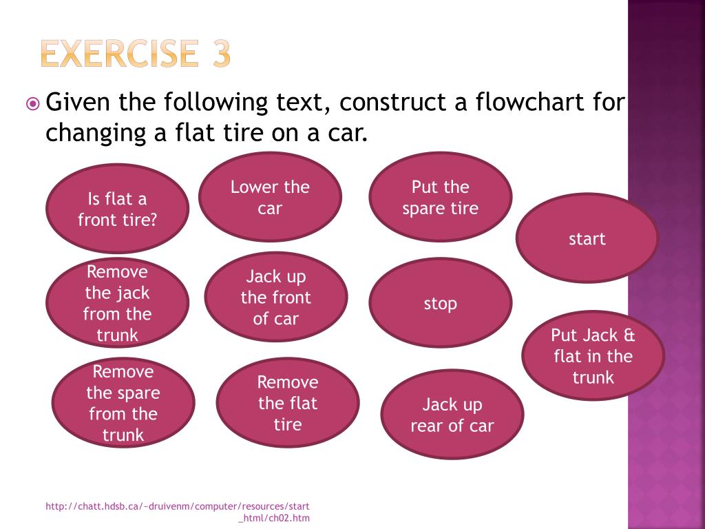 Exercise 3 • Given the following text, construct a flowchart for changing a flat tire on a car. Lower the car Put the spare tire Is flat a front tire? start Jack up the front of car Remove the jack from the trunk stop Put Jack & flat in the trunk Remove the spare from the trunk Remove the flat tire Jack up rear of car http://chatt.hdsb.ca/~druivenm/computer/resources/start_html/ch02.htm