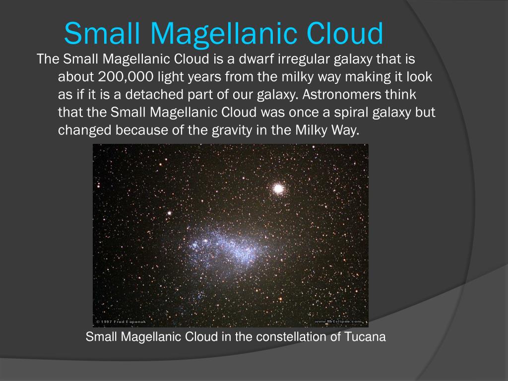 Small Magellanic Cloud The Small Magellanic Cloud is a dwarf irregular galaxy that is about 200,000 light years from the milky way making it look as if it is a detached part of our galaxy. Astronomers think that the Small Magellanic Cloud was once a spiral galaxy but changed because of the gravity in the Milky Way. Small Magellanic Cloud in the constellation of Tucana