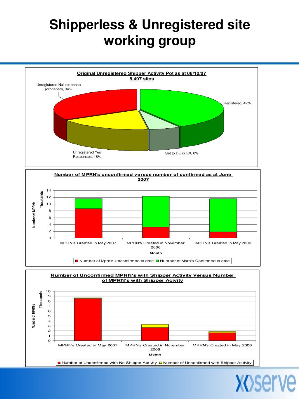 Shipperless & Unregistered site working group The End User letter trial carried out in July and August 2007 took a relative sample of 1000 sites across the age profile of the USNANA data set. The extrapolated results indicate that 16% of sites should be confirmed as using gas. 19% are legitimately shipperless 29% are erroneous 36% may need a site visit to establish the status A plot address sample of 365 sites concentrated on plots created in 2003 and 2004 and allowed us to update 26% to the correct address.