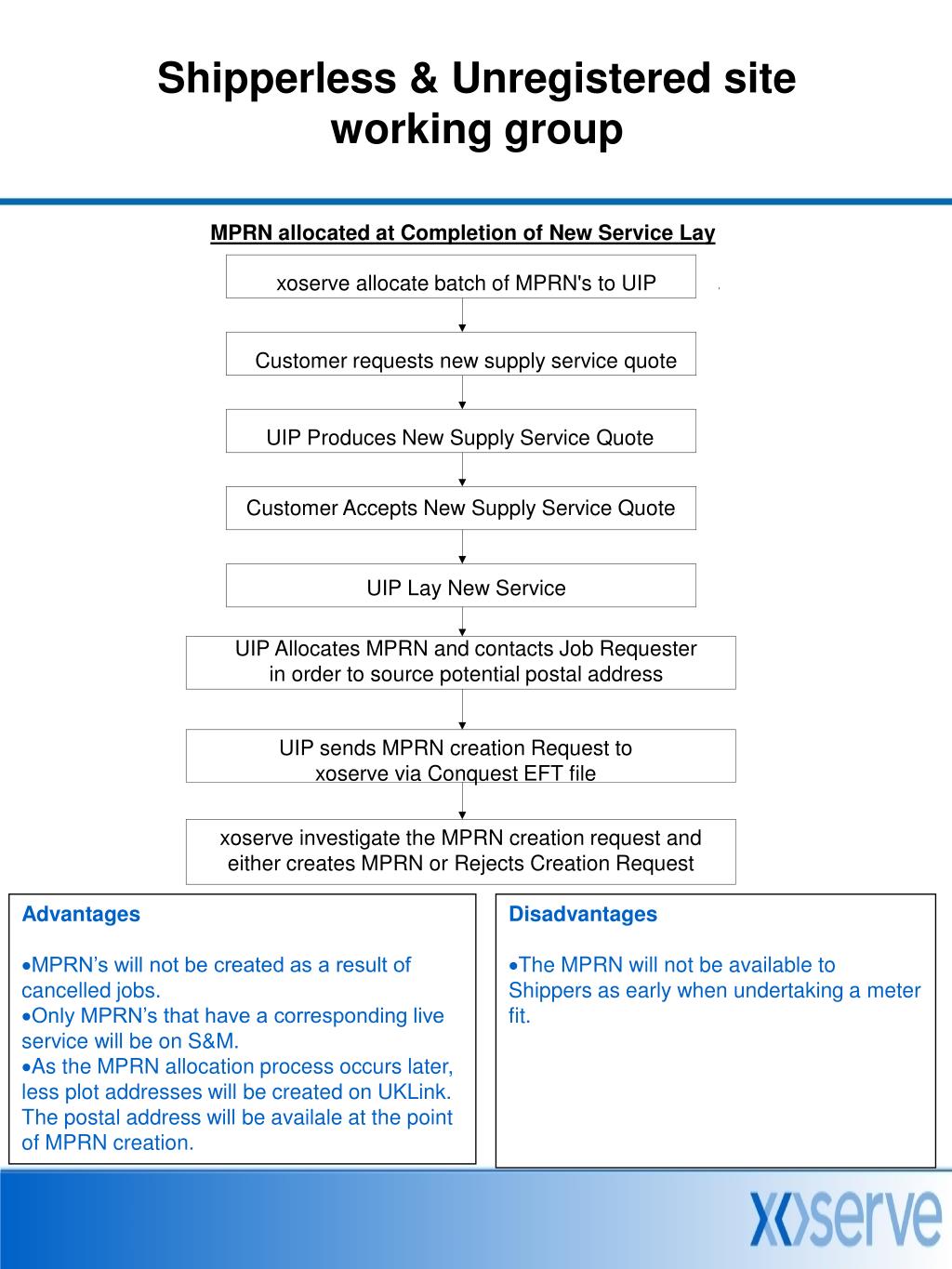 MPRN allocated at Meter Fit xoserve allocate batch of MPRN's to UIP Customer requests new supply service quote UIP Produces New Supply Service Quote Customer Accepts New Supply Service Quote UIP Lay New Service Shipper undertakes meter fit and informs UIP that meter fit job has been completed UIP Allocates MPRN and Informs jobrequester of MPRN. UIP sends MPRN creation Request to xoserve via Conquest EFT file xoserve investigate the MPRN creation request and either creates MPRN or Rejects Creation Request Shipperless & Unregistered site working group • Advantages • No MPRN created for cancelled new service jobs. • Less plot addresses created on S&M as postal address is available at the point of creation. • Only MPRN that has a corresponding live service will be on S&M. • Majority of MPRN’s can be linked to a shipper via meter fit job. • All created MPRN’s will have a live service and meter. • Disadvantages • The MPRN will not be available to Shippers when undertaking a meter fit.