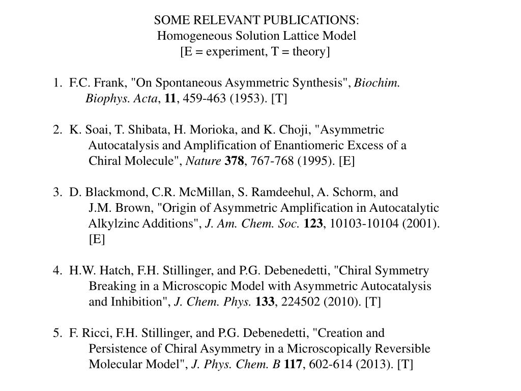 SOME RELEVANT PUBLICATIONS: Homogeneous Solution Lattice Model [E = experiment, T = theory] 1. F.C. Frank, "On Spontaneous Asymmetric Synthesis", Biochim. Biophys. Acta, 11, 459-463 (1953). [T] 2. K. Soai, T. Shibata, H. Morioka, and K. Choji, "Asymmetric Autocatalysis and Amplification of Enantiomeric Excess of a Chiral Molecule", Nature378, 767-768 (1995). [E] 3. D. Blackmond, C.R. McMillan, S. Ramdeehul, A. Schorm, and J.M. Brown, "Origin of Asymmetric Amplification in Autocatalytic Alkylzinc Additions", J. Am. Chem. Soc.123, 10103-10104 (2001). [E] 4. H.W. Hatch, F.H. Stillinger, and P.G. Debenedetti, "Chiral Symmetry Breaking in a Microscopic Model with Asymmetric Autocatalysis and Inhibition", J. Chem. Phys. 133, 224502 (2010). [T] 5. F. Ricci, F.H. Stillinger, and P.G. Debenedetti, "Creation and Persistence of Chiral Asymmetry in a Microscopically Reversible Molecular Model", J. Phys. Chem. B117, 602-614 (2013). [T]