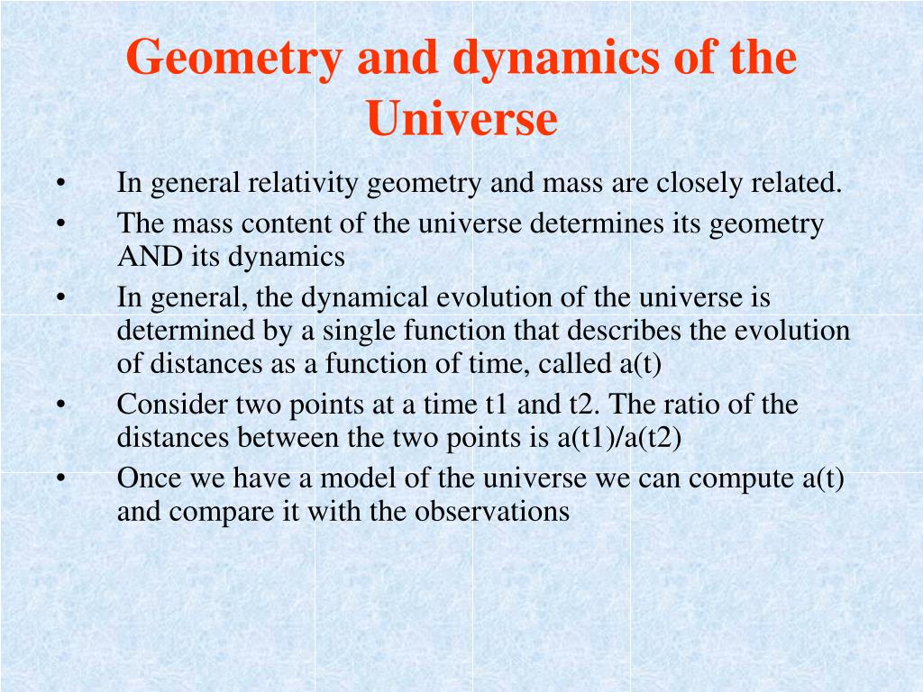 Geometry and dynamics of the Universe • In general relativity geometry and mass are closely related. • The mass content of the universe determines its geometry AND its dynamics • In general, the dynamical evolution of the universe is determined by a single function that describes the evolution of distances as a function of time, called a(t) • Consider two points at a time t1 and t2. The ratio of the distances between the two points is a(t1)/a(t2) • Once we have a model of the universe we can compute a(t) and compare it with the observations
