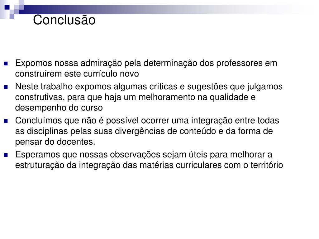 Conclusão Expomos nossa admiração pela determinação dos professores em construírem este currículo novo Neste trabalho expomos algumas críticas e sugestões que julgamos construtivas, para que haja um melhoramento na qualidade e desempenho do curso Concluímos que não é possível ocorrer uma integração entre todas as disciplinas pelas suas divergências de conteúdo e da forma de pensar do docentes. Esperamos que nossas observações sejam úteis para melhorar a estruturação da integração das matérias curriculares com o território
