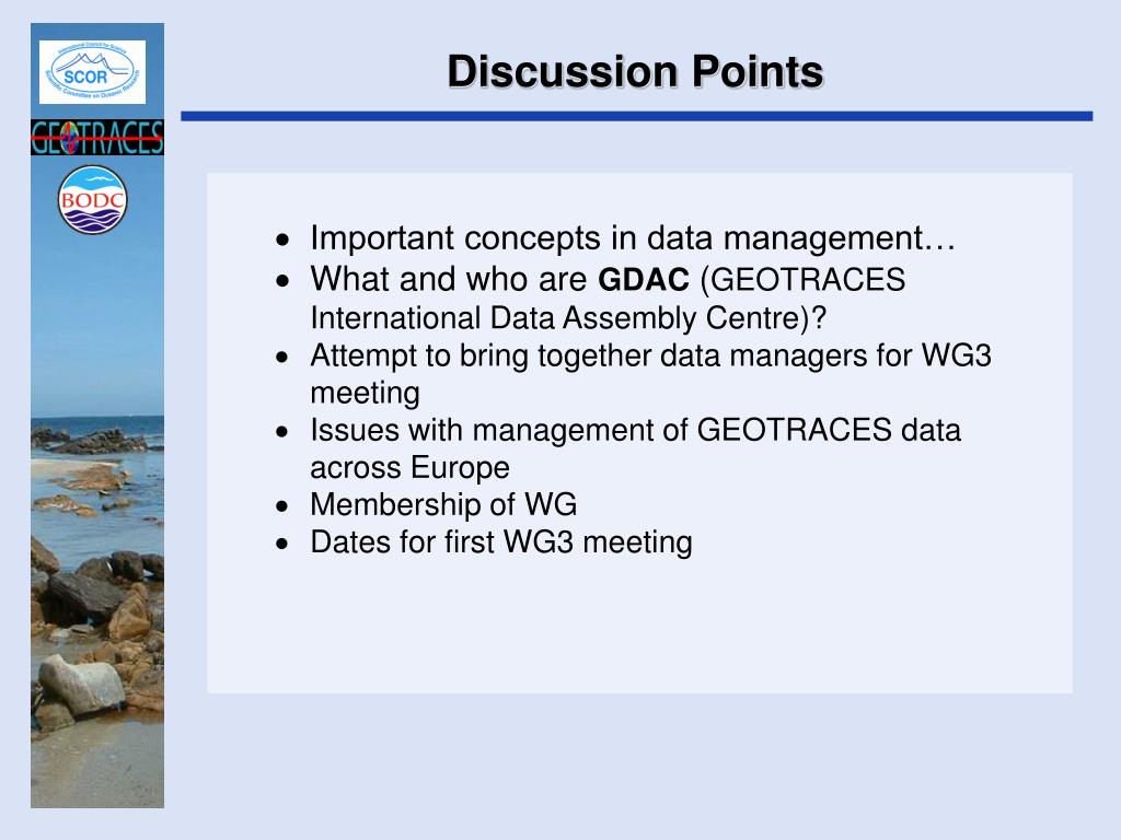 Discussion Points • Important concepts in data management… • What and who are GDAC (GEOTRACES International Data Assembly Centre)? • Attempt to bring together data managers for WG3 meeting • Issues with management of GEOTRACES data across Europe • Membership of WG • Dates for first WG3 meeting