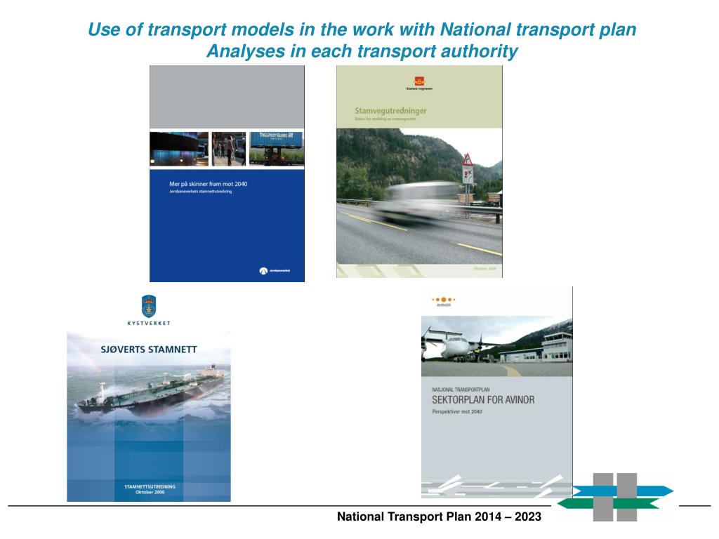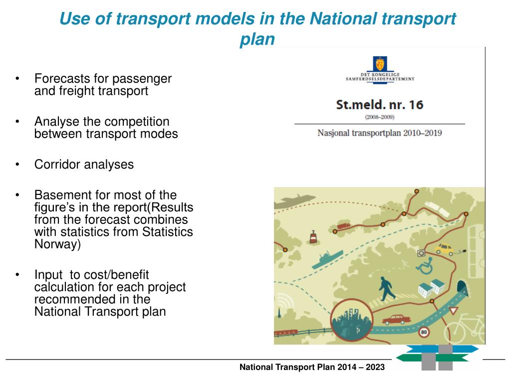 Use of transport models in the National transport plan • Forecasts for passenger and freight transport • Analyse the competition between transport modes • Corridor analyses • Basement for most of the figure’s in the report(Results from the forecast combines with statistics from Statistics Norway) • Input to cost/benefit calculation for each project recommended in the National Transport plan National Transport Plan 2014 – 2023