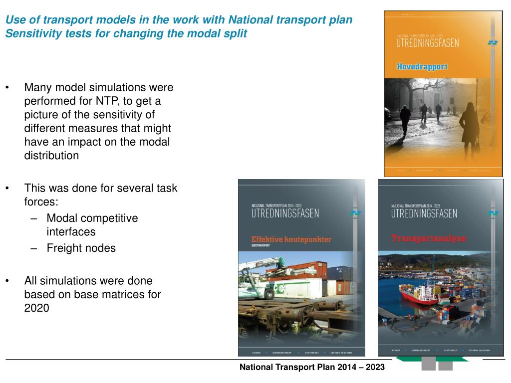 Use of transport models in the work with National transport plan Sensitivity tests for changing the modal split • Many model simulations were performed for NTP, to get a picture of the sensitivity of different measures that might have an impact on the modal distribution • This was done for several task forces: • Modal competitive interfaces • Freight nodes • All simulations were done based on base matrices for 2020 National Transport Plan 2014 – 2023