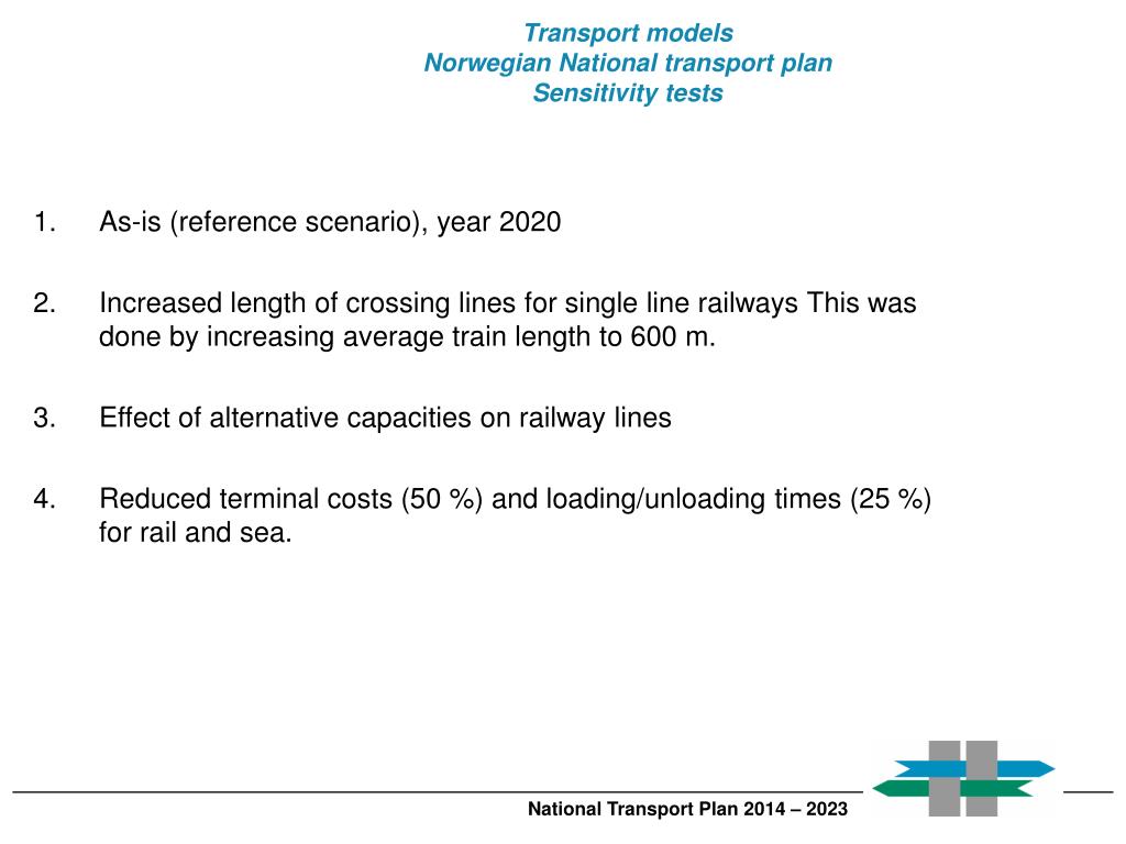 Transport models Norwegian National transport plan Sensitivity tests • As-is (reference scenario), year 2020 • Increased length of crossing lines for single line railways This was done by increasing average train length to 600 m. • Effect of alternative capacities on railway lines • Reduced terminal costs (50 %) and loading/unloading times (25 %) for rail and sea. National Transport Plan 2014 – 2023