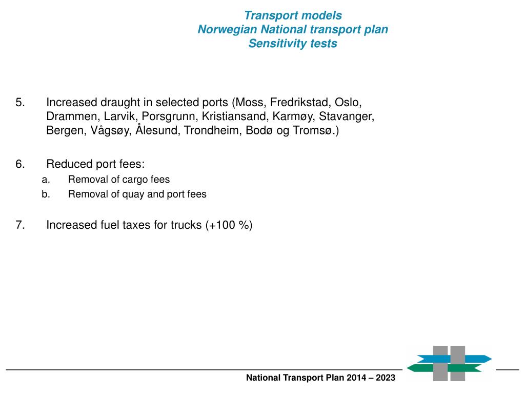 Transport models Norwegian National transport plan Sensitivity tests • Increased draught in selected ports (Moss, Fredrikstad, Oslo, Drammen, Larvik, Porsgrunn, Kristiansand, Karmøy, Stavanger, Bergen, Vågsøy, Ålesund, Trondheim, Bodø og Tromsø.) • Reduced port fees: • Removal of cargo fees • Removal of quay and port fees • Increased fuel taxes for trucks (+100 %) National Transport Plan 2014 – 2023