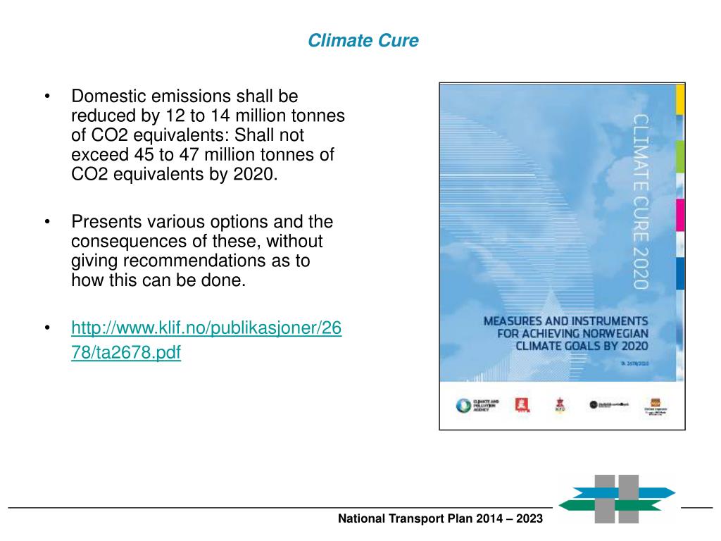 Climate Cure • Domestic emissions shall be reduced by 12 to 14 million tonnes of CO2 equivalents: Shall not exceed 45 to 47 million tonnes of CO2 equivalents by 2020. • Presents various options and the consequences of these, without giving recommendations as to how this can be done. • http://www.klif.no/publikasjoner/2678/ta2678.pdf National Transport Plan 2014 – 2023