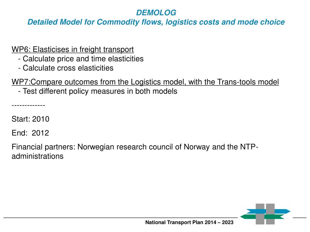 DEMOLOG Detailed Model for Commodity flows, logistics costs and mode choice • WP6: Elasticises in freight transport - Calculate price and time elasticities - Calculate cross elasticities • WP7:Compare outcomes from the Logistics model, with the Trans-tools model - Test different policy measures in both models • ------------- • Start: 2010 • End: 2012 • Financial partners: Norwegian research council of Norway and the NTP-administrations National Transport Plan 2014 – 2023