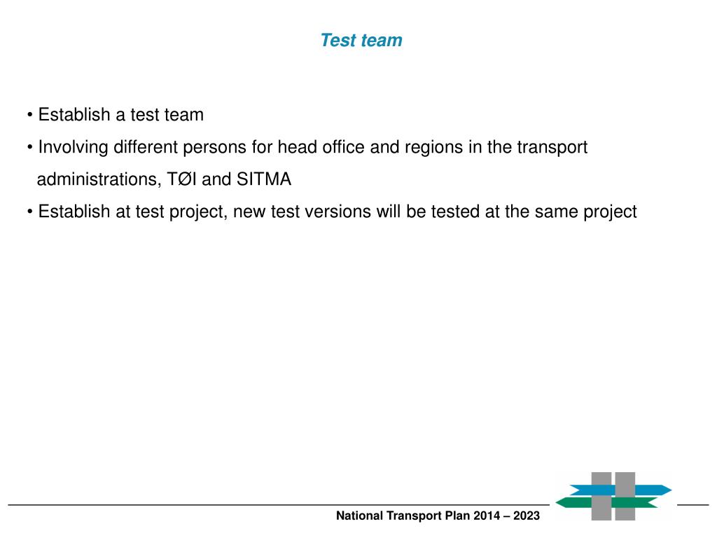 Test team • Establish a test team • Involving different persons for head office and regions in the transport • administrations, TØI and SITMA • Establish at test project, new test versions will be tested at the same project National Transport Plan 2014 – 2023