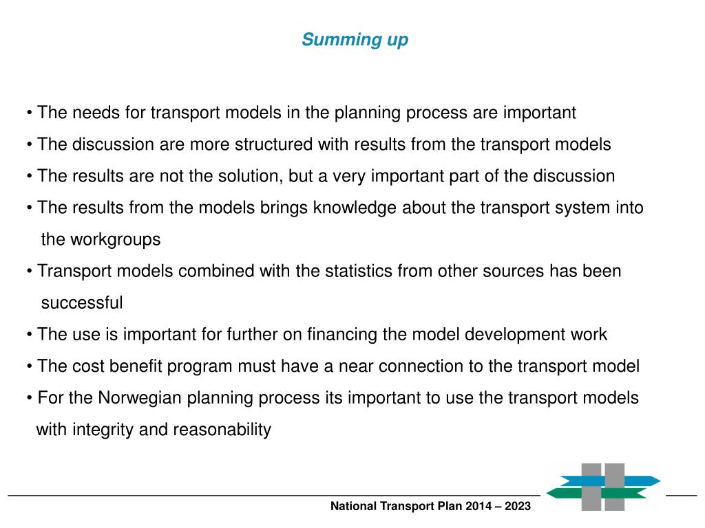 Summing up • The needs for transport models in the planning process are important • The discussion are more structured with results from the transport models • The results are not the solution, but a very important part of the discussion • The results from the models brings knowledge about the transport system into • the workgroups • Transport models combined with the statistics from other sources has been • successful • The use is important for further on financing the model development work • The cost benefit program must have a near connection to the transport model • For the Norwegian planning process its important to use the transport models • with integrity and reasonability National Transport Plan 2014 – 2023