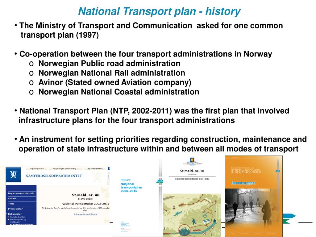 National Transport plan - history • The Ministry of Transport and Communication asked for one common transport plan (1997) • Co-operation between the four transport administrations in Norway • Norwegian Public road administration • Norwegian National Rail administration • Avinor (Stated owned Aviation company) • Norwegian National Coastal administration • National Transport Plan (NTP, 2002-2011) was the first plan that involved infrastructure plans for the four transport administrations • An instrument for setting priorities regarding construction, maintenance and operation of state infrastructure within and between all modes of transport National Transport Plan 2014 – 2034