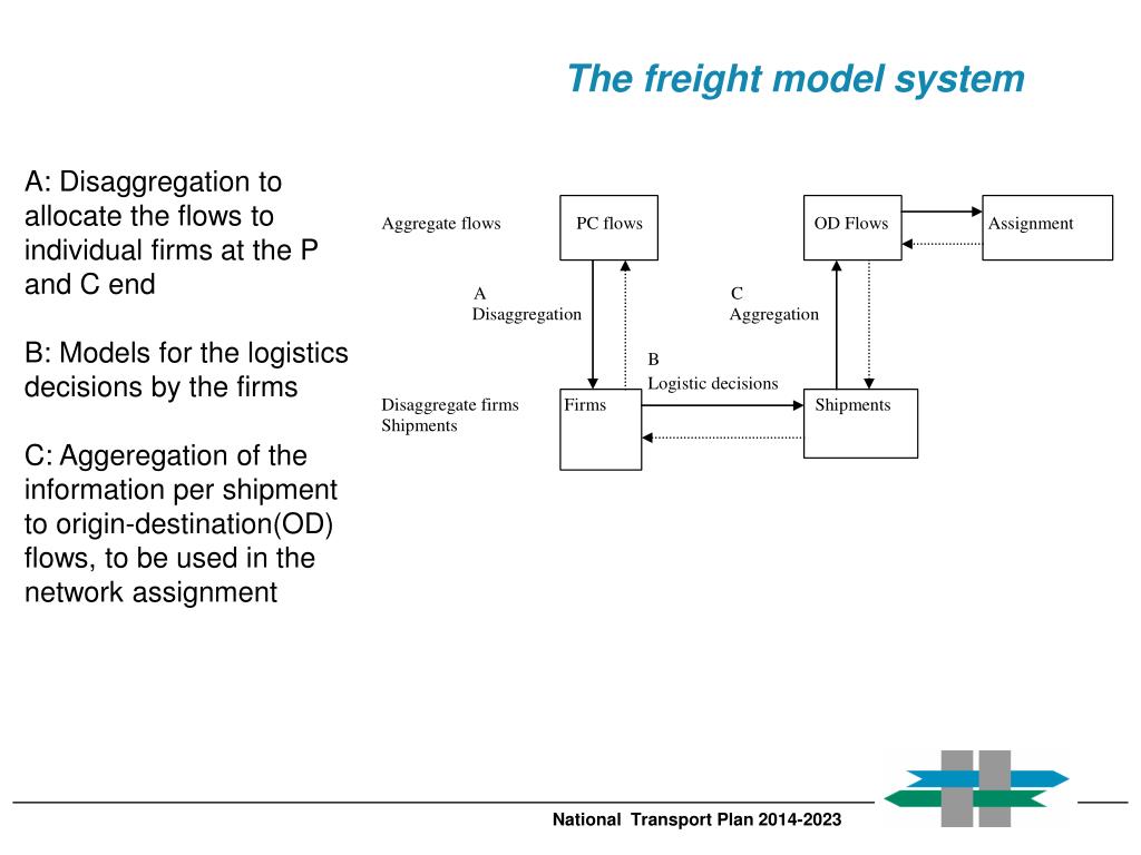 The freight model system A: Disaggregation to allocate the flows to individual firms at the P and C end B: Models for the logistics decisions by the firms C: Aggeregation of the information per shipment to origin-destination(OD) flows, to be used in the network assignment National Transport Plan 2014-2023