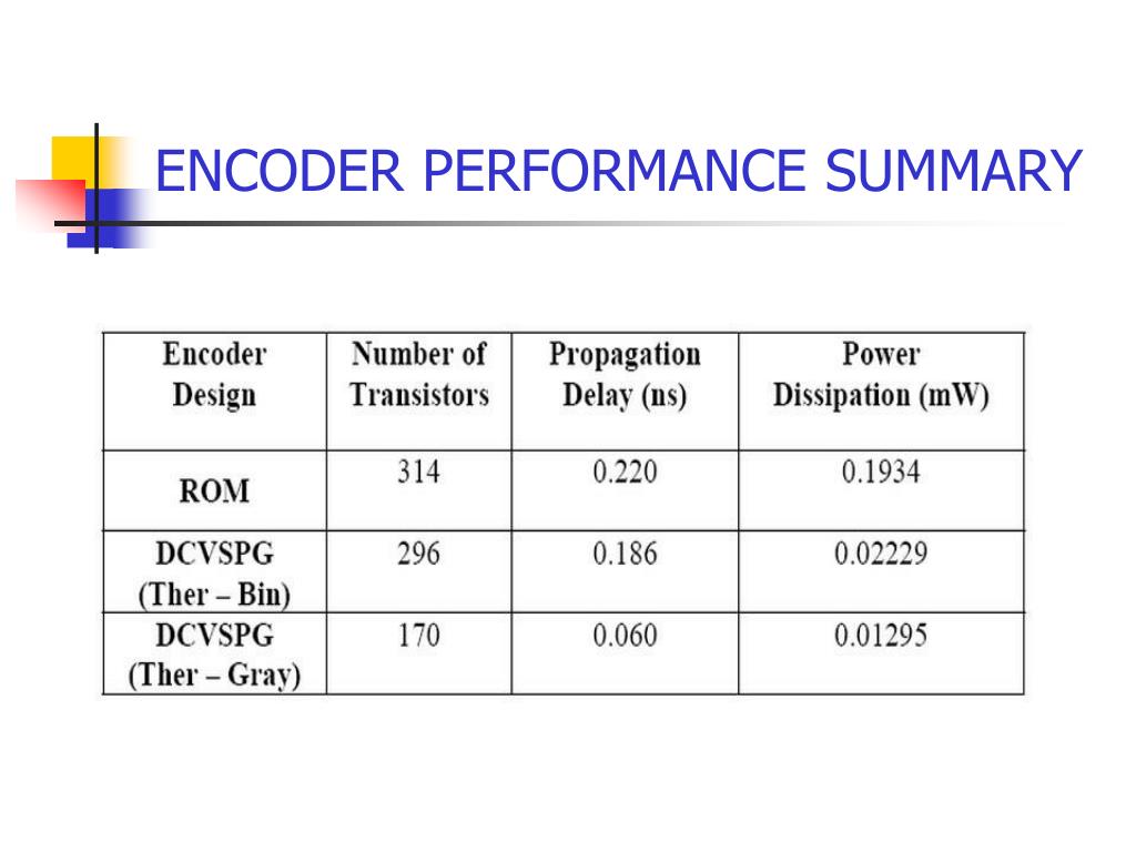 Experimental Results • The 4-bit flash ADC is designed and simulated in 130 nanometer CMOS. • Both INL and DNL as shown in the table are less than 0.3 LSB. The average power consumption is 23.78 mW. The simulation of the ADC with 250 MHz input signal. • The power consumption of the DCVSPG encoder is 88 % less than the conventional ROM encoder.