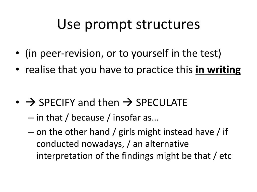 Use prompt structures • (in peer-revision, or to yourself in the test) • realise that you have to practice this in writing • SPECIFY and then SPECULATE • in that / because / insofar as… • on the other hand / girls might instead have / if conducted nowadays, / an alternative interpretation of the findings might be that / etc