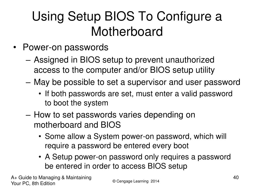 Using Setup BIOS To Configure a Motherboard • Power-on passwords • Assigned in BIOS setup to prevent unauthorized access to the computer and/or BIOS setup utility • May be possible to set a supervisor and user password • If both passwords are set, must enter a valid password to boot the system • How to set passwords varies depending on motherboard and BIOS • Some allow a System power-on password, which will require a password be entered every boot • A Setup power-on password only requires a password be entered in order to access BIOS setup A+ Guide to Managing & Maintaining Your PC, 8th Edition