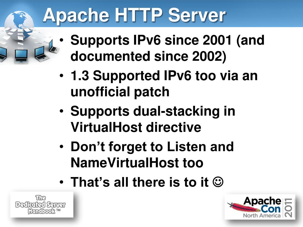 Apache HTTP Server • Supports IPv6 since 2001 (and documented since 2002) • 1.3 Supported IPv6 too via an unofficial patch • Supports dual-stacking in VirtualHost directive • Don’t forget to Listen and NameVirtualHost too • That’s all there is to it