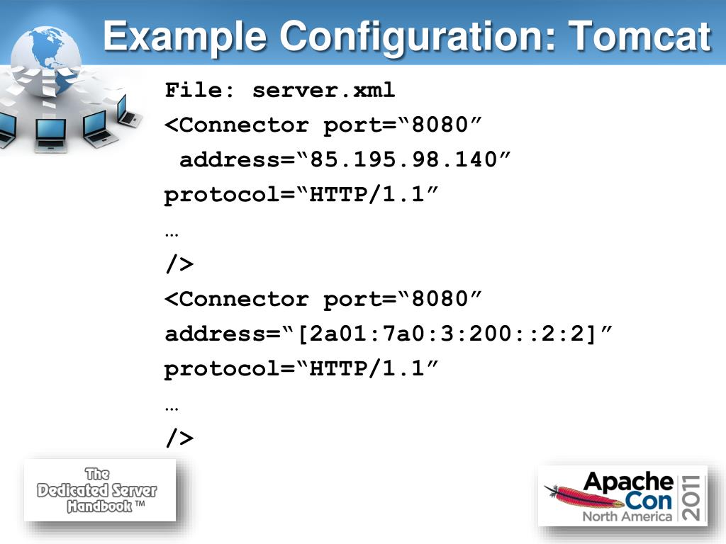 Example Configuration: Tomcat File: server.xml <Connector port=“8080” address=“85.195.98.140” protocol=“HTTP/1.1” … /> <Connector port=“8080” address=“[2a01:7a0:3:200::2:2]” protocol=“HTTP/1.1” … />