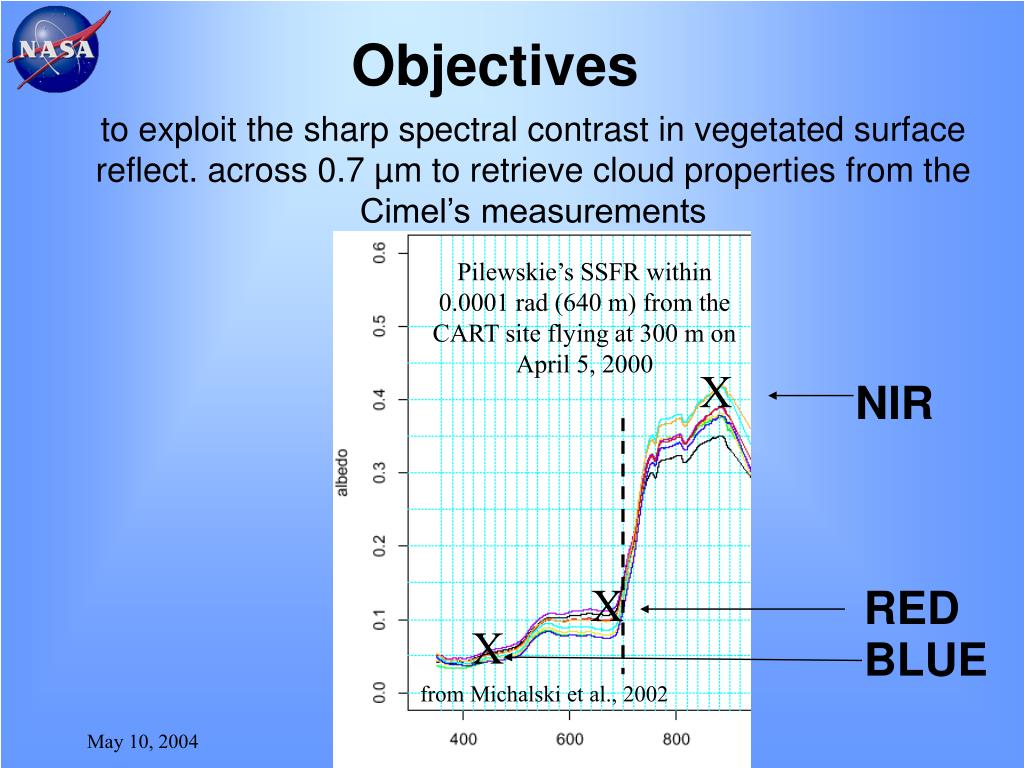 Pilewskie’s SSFR within 0.0001 rad (640 m) from the CART site flying at 300 m on April 5, 2000 X NIR X RED X BLUE from Michalski et al., 2002 Objectives to exploit the sharp spectral contrast in vegetated surface reflect. across 0.7 µm to retrieve cloud properties from the Cimel’s measurements Aeronet workshop