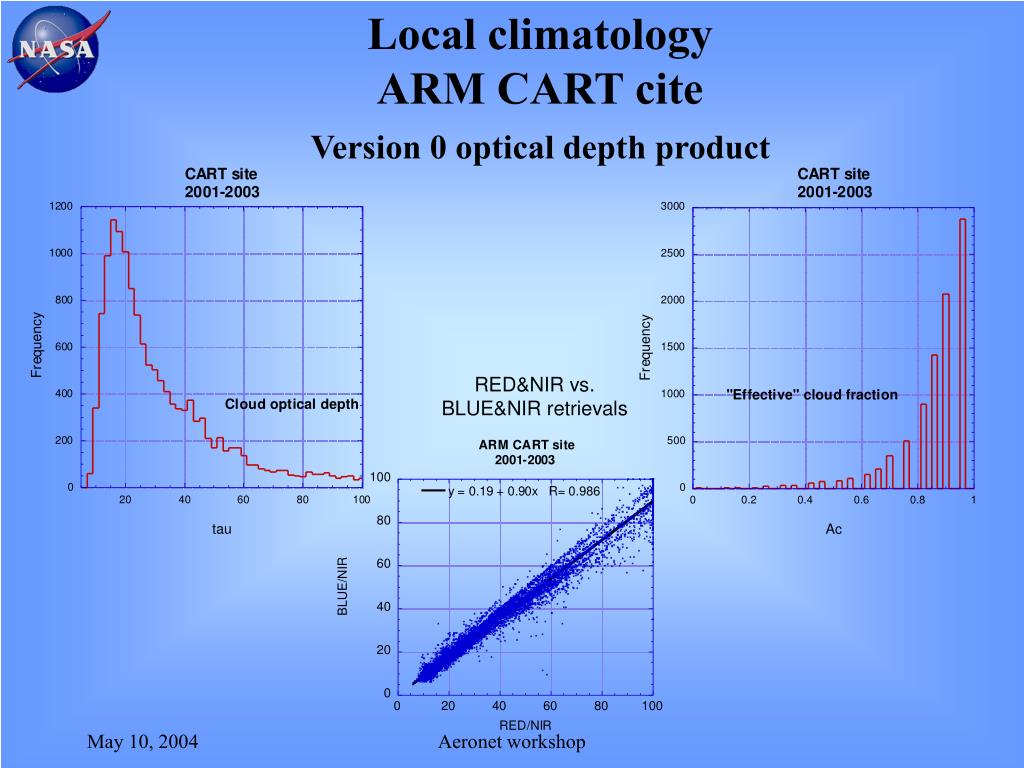 Local climatology ARM CART cite Version 0 optical depth product RED&NIR vs. BLUE&NIR retrievals Aeronet workshop