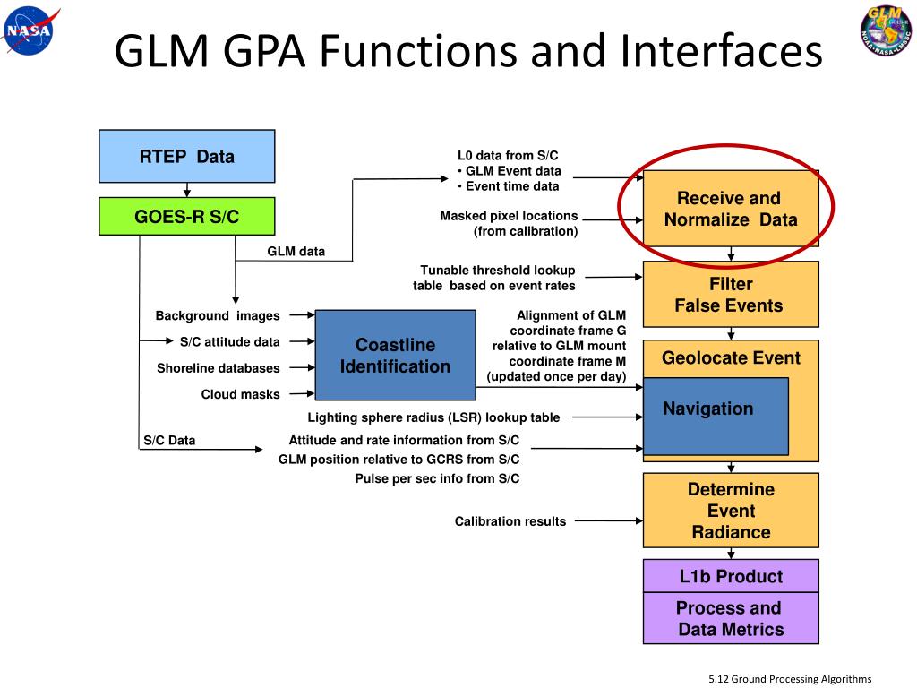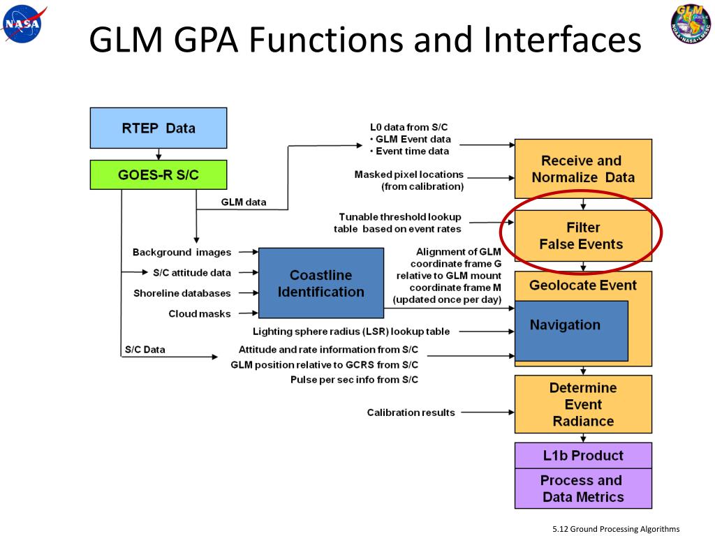 GLM GPA Functions and Interfaces RTEP Data • L0 data from S/C • GLM Event data • Event time data Receive and Normalize Data GOES-R S/C Masked pixel locations (from calibration) GLM data Tunable threshold lookup table based on event rates Filter False Events L1b Product Alignment of GLM coordinate frame G relative to GLM mount coordinate frame M (updated once per day) Background images Process and Data Metrics Coastline Identification S/C attitude data Geolocate Event Shoreline databases Cloud masks Navigation Lighting sphere radius (LSR) lookup table Attitude and rate information from S/C GLM position relative to GCRS from S/C Pulse per sec info from S/C S/C Data Determine Event Radiance Calibration results 5.12 Ground Processing Algorithms