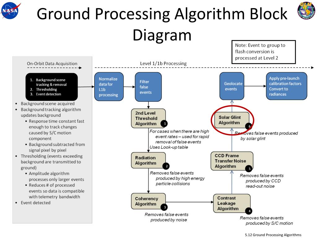 Expected Performance of Solar Glint • The rate of solar glint produced false events is expected to be much lower for GLM than LIS because of the quasi-stationary orbit of GOES relative to TRMM in LEO • S/C motion modulated the bright glint scene causing events • However GLM will receive glint from lower incident angles, producing brighter glint • Waves and cloud boundaries will modulate the glint, causing events • LIS used a 100% exclusion zone around glint resulting in a 100% glint event removal efficiency. • GLM will use less restrictive criteria in order to detect lightning that may occur within the glint exclusion zone • These criteria will be tuned using both calibration and initial on-orbit observations 5.12 Ground Processing Algorithms