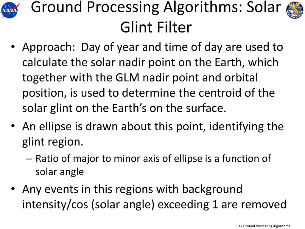 Ground Processing Algorithms: Solar Glint Filter • Approach: Day of year and time of day are used to calculate the solar nadir point on the Earth, which together with the GLM nadir point and orbital position, is used to determine the centroid of the solar glint on the Earth’s on the surface. • An ellipse is drawn about this point, identifying the glint region. • Ratio of major to minor axis of ellipse is a function of solar angle • Any events in this regions with background intensity/cos (solar angle) exceeding 1 are removed 5.12 Ground Processing Algorithms