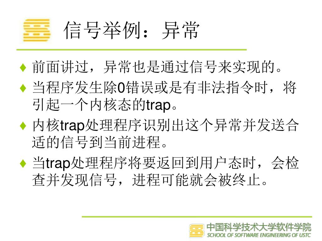 信号举例:异常 • 前面讲过,异常也是通过信号来实现的。 • 当程序发生除0错误或是有非法指令时,将引起一个内核态的trap。 • 内核trap处理程序识别出这个异常并发送合适的信号到当前进程。 • 当trap处理程序将要返回到用户态时,会检查并发现信号,进程可能就会被终止。