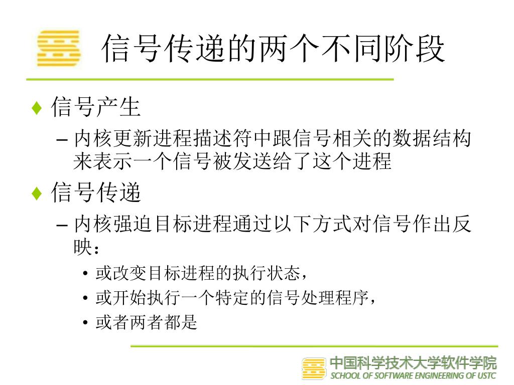 信号传递的两个不同阶段 • 信号产生 • 内核更新进程描述符中跟信号相关的数据结构来表示一个信号被发送给了这个进程 • 信号传递 • 内核强迫目标进程通过以下方式对信号作出反映: • 或改变目标进程的执行状态, • 或开始执行一个特定的信号处理程序, • 或者两者都是