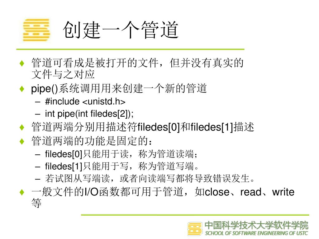 创建一个管道 • 管道可看成是被打开的文件,但并没有真实的文件与之对应 • pipe()系统调用用来创建一个新的管道 • #include <unistd.h> • int pipe(int filedes[2]); • 管道两端分别用描述符filedes[0]和filedes[1]描述 • 管道两端的功能是固定的: • filedes[0]只能用于读,称为管道读端; • filedes[1]只能用于写,称为管道写端。 • 若试图从写端读,或者向读端写都将导致错误发生。 • 一般文件的I/O函数都可用于管道,如close、read、write等