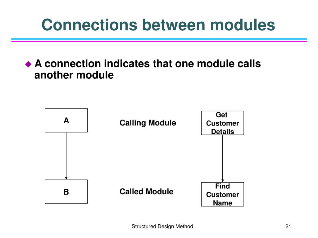 Connections between modules • A connection indicates that one module calls another module A Get Customer Details Calling Module B Find Customer Name Called Module